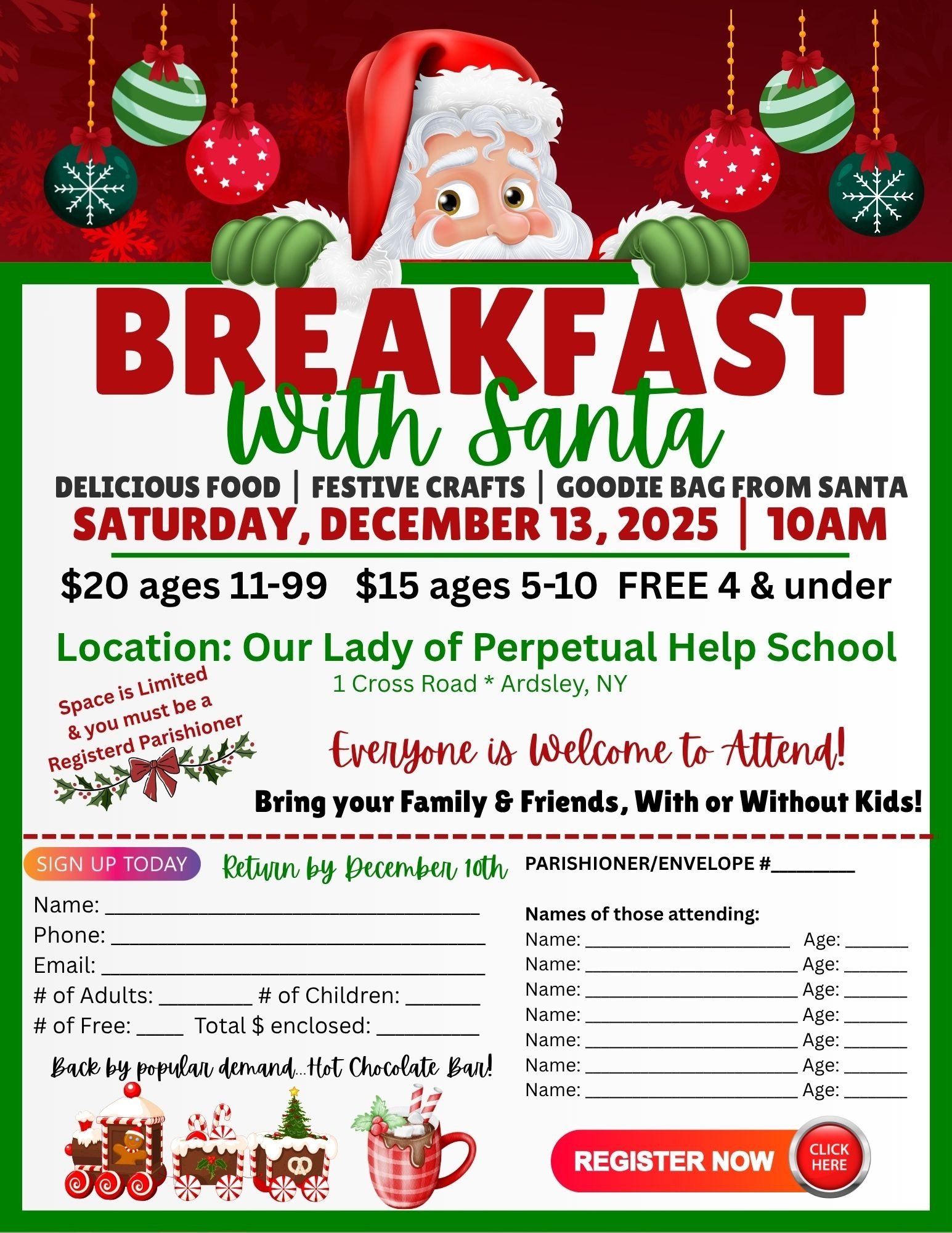 To Register for BREAKFAST WITH SANTA, please click on the GREEN sign-up bar below, or call the rectory: 914-478-2822 Sign up for BREAKFAST WITH SANTA 2025 Volunteers are once again needed to help...